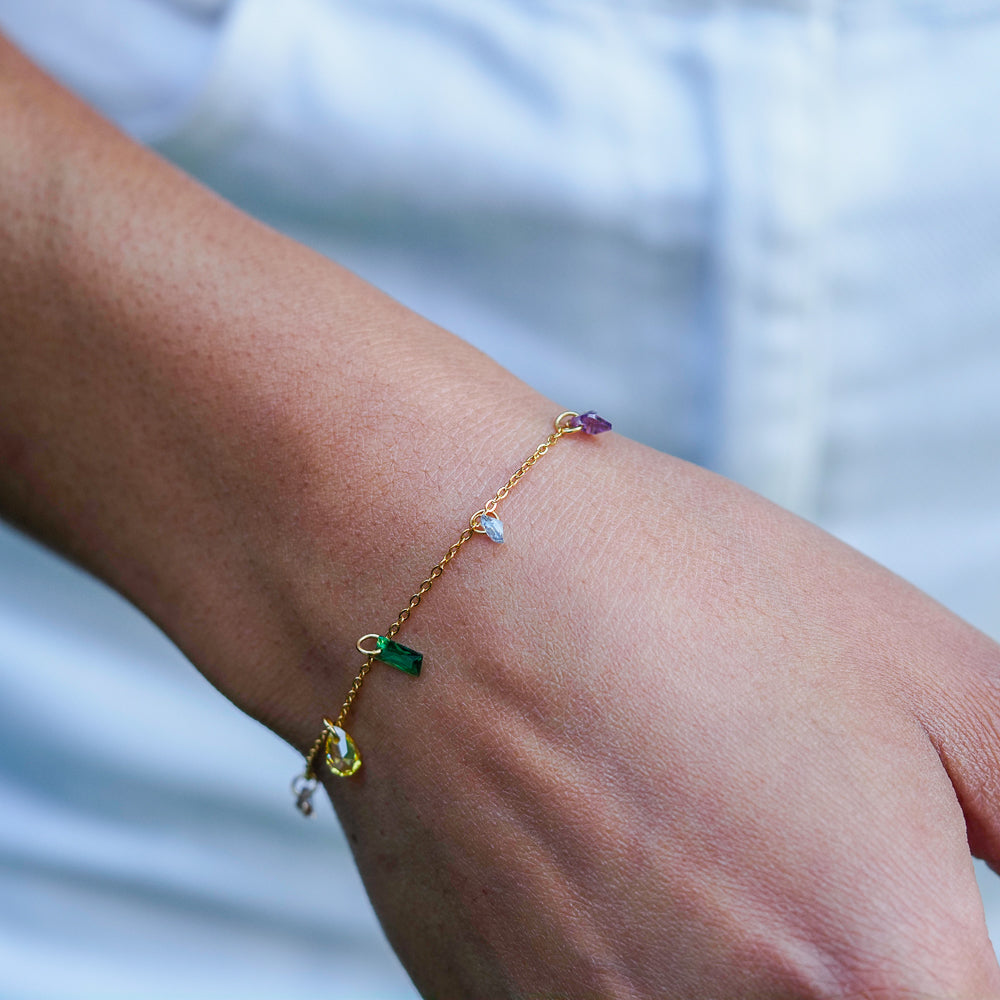 The Rainbow Droplet Bracelet is as diverse as you are - with mutli-coloured and multi-shaped stones it dangles beautifully on the wrist, making for the perfect accessory for everyday wear or as an occassional statement piece.
